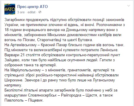 „În Artemovsk, teroriştii au folosit tancuri și mortiere. A avut de suferit şi punctul de trecere Zaiţevo, tocmai când acolo erau foarte mulţi civili”, potrivit unei postrăi publicate pe facebook de ATO.